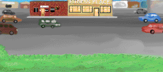 You start at a bus stop, with a theater to your right and a parking lot with the Pizza Place and a Fitness Place to your left.